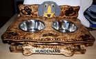 Hundeskulptur, Futternapfständer aus Holz mit 2 Edelstahlnäpfen
